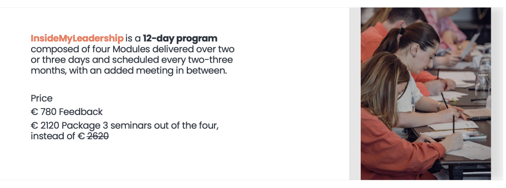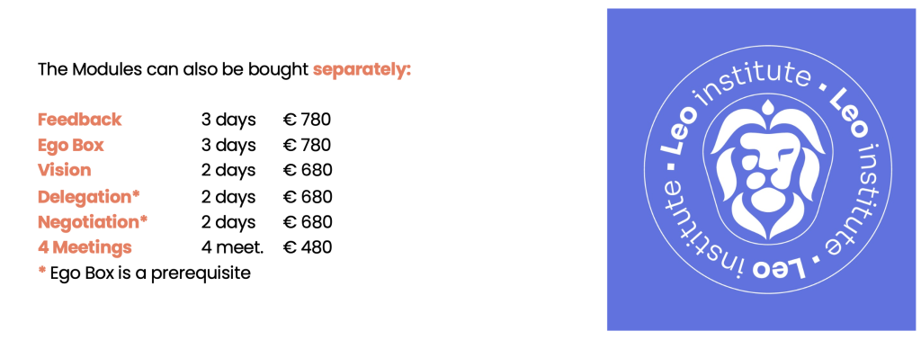 It is composed by an entry seminar to validate the decision of the leader to participate in the program. the entry seminar can be either The Art of Giving and Receiving Feedback or the Ego Box